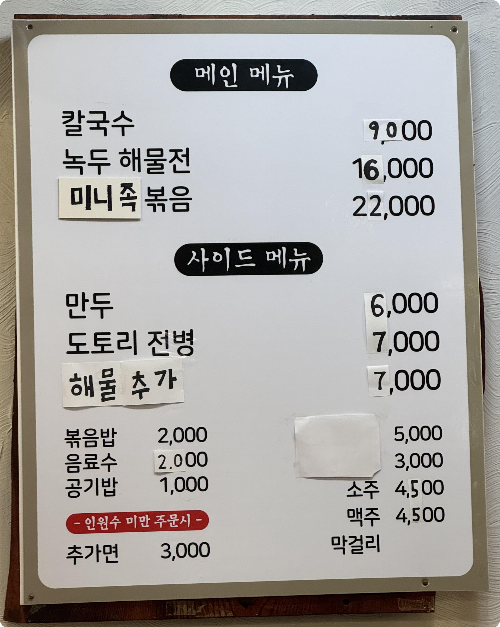 메뉴판을 보면 가격 고민한 흔적이 보인다. 아무래도 물가 상승에 따른 원재료값도 무시 못했기에 올렸을 거라고 본다. 가장 아래 "인원수 미만 주문 시 추가면 3,000원"이 보인다. 그렇다. 이곳은 면추가시 무료인데, 간혹 인원수보다 적은 숫자로 칼국수 주문하고 리필해 먹는 경우가 있는 것으로 의심된다.