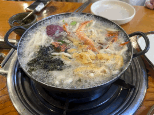 면은 일부 익어서 나오므로 매장에서 추천하는 추가 가열은 "3분"이다. 그냥 일행과 간단히 몇 마디 나누다 보면 이미 익어있다. 면발이 굵어 식감이 좋고 추가 양념 없어도 맛이 좋다. 도대체 칼국수 맛없게 끓이는 법이 있기나 한 것인가? 뜨끈한 국물에 호로록...