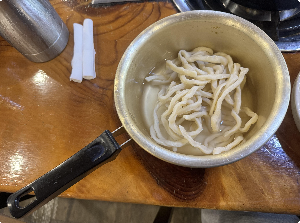 칼국수 면 리필은 셀프다. 예전엔 주문으로 했었는데, 아무래도 주문자들이 많다 보니 셀프로 전환된 것 같다. 양은 냄비에 면만 담겨있으므로 가져올 때 뜨거운 물을 담아 온다. 기존 칼국수의 육수가 쫄아들어 짜졌기 때문에 물 보충하는 것도 있지만, 면을 미리 뜨거운 물을 담가놓으면 면이 적절하게 물에 불기 때문에 아주 조~금 더 빨리 익을... 걸...?