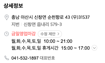 아산에 있는 순천향 대학교 근처에 있다. 신창 119 안전센터 길건너에 있다고 하면 조금 더 쉽게 설명이 되려나?